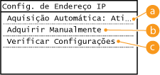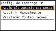 ![]() Se aparecer <Ativado>, toque em <Aquisição Automática> e defina <Selecionar Protocolo> e <IP Automático> em <Desativado>.