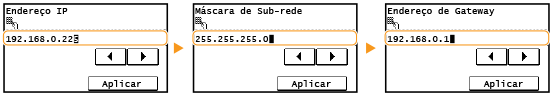 <Máscara de Sub-rede> <Endereço de Gateway>.Introduza cada definição utilizando as teclas numéricas e toque em <Aplicar>.