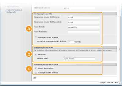 Adotado pelo serviço Bonjour, o mDNS (multicast DNS) é um protocolo utilizado para associar um nome de anfitrião a um endereço IP sem utilizar DNS. Selecione a caixa de verificação para ativar o mDNS e introduza o nome de mDNS na caixa de texto [Nome de mDNS:]. [Configurações de Opção DHCP][Adquirir Nome de Host]