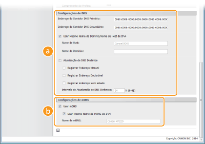 Selecione a caixa de verificação para atualizar os registos DNS dinamicamente, sempre que o endereço IP da máquina for alterado. Para especificar o(s) tipo(s) de endereços que pretende gravar no servidor DNS, selecione a caixa de verificação de [Registrar Endereço Manual:], [Registrar Endereço Declarável:] ou [Registrar Endereço Sem Estado]. Para especificar o intervalo entre atualizações, introduza o tempo em horas na caixa de texto [Intervalo de Atualização de DNS Dinâmico:] [Configurações de mDNS][Usar mDNS]