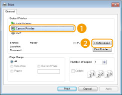 Selectaţi driverul de imprimantă pentru aparat şi faceţi clic pe [Preferences] (Preferinţe), [Properties] (Proprietăţi) sau [More Settings] (Mai multe setări).