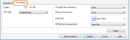 Faceţi clic pe fila [Print Settings] (Setări imprimare) pentru a afişa ecranul pentru specificarea setărilor pentru imprimare precum numărul de copii sau imprimare pe 1-faţă/2-feţe. Setările specificate aici se aplică întregii lucrări de imprimare.