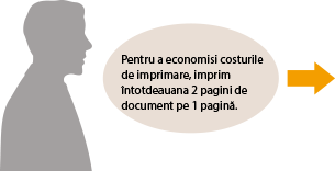 Setaţi [2 on 1] (2 pe 1) ca setare implicită în driverul imprimantei. Începând cu următoarea lucrare de imprimare, fiecare pagină imprimată va afişa 2 pagini din document. Modificarea setărilor implicite