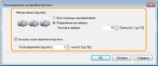 [Разделение на наборы]: печать отдельными партиями, разделенными по номерам страниц, указанным в пункте [Листов в наборе]. Скрепите каждую партию страниц и соедините их в один буклет. Используйте эту функцию в случаях, когда документ содержит слишком много страниц для печати в виде одного буклета.