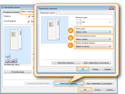 Выберите положение печати для даты печати, имени пользователя и номера страницы