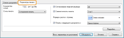 Щелкните вкладку [Print Settings] (Параметры печати), чтобы отобразить окно настройки параметров печати, например, количество копий, 1-сторонняя/2-сторонняя печать. Заданные параметры будут применяться ко всему заданию печати.