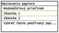 Musíte špecifikovať nastavenia formátu a typu papiera tak, aby sa zhodovali s vloženým papierom. Keď vkladáte papier, ktorý sa líši od predtým vloženého papiera, nezabudnite zmeniť nastavenia papiera. Môžete tiež uložiť štandardný formát a typ papiera pre mnohoúčelový priečinok, čo je užitočné, ak stále vkladáte papier rovnakého formátu a typu.