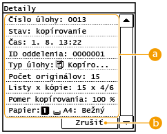 Zobrazí sa počet kópií, nastavenia a iné detaily. Ak chcete iba skontrolovať detaily bez zrušenia kopírovania, stlačením tlačidla