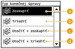 Keď pripravujete viaceré kópie viacstranových dokumentov, môžete vybrať poradie skopírovaných papierov <Skupina>, <Triediť>, <Otočiť + zoskupiť> alebo <Otočiť + triediť>. Táto funkcia je užitočná pri príprave materiálov na schôdze alebo prezentácie.