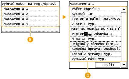 Môžete uložiť až štyri často používané kombinácie nastavení kopírovania. Jednoduchým výberom uloženej potrebnej kombinácie nastavení môžete eliminovať potrebu konfigurácie rovnakých nastavení pri každom kopírovaní, napríklad ak často nastavujete počet kópií na 5, nastavte položku <Vymazať rám> na možnosť <Zap.> a zvýšte ostrosť pri kopírovaní. Môžete uložiť kombinácie nastavenia ako <Nastavenia 1> až <Nastavenia 4>.