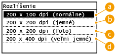 Môžete vybrať rozlíšenie vhodné pre váš typ dokumentu. Čím je väčšie rozlíšenie, tým je zreteľnejší obraz, ale o to dlhšie trvá odoslanie.