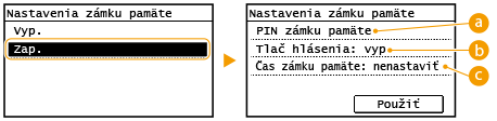 Ak chcete ukladať prijaté dokumenty do pamäte, nastavte položku <Nastavenia zámku pamäte> na možnosť <Zap.>. Môžete tiež špecifikovať voliteľné nastavenia, ako je nastavenie zabezpečenia, ktoré bude na odomknutie funkcie vyžadovať heslo, a nastavenie času, ktorý špecifikuje dobu, v ktorej sa prijaté dokumenty uložia do pamäte.