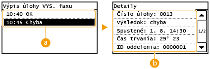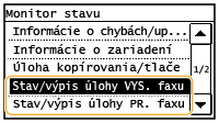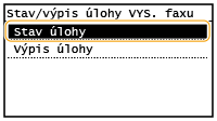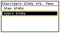 ![]() <Výpis úlohy VYS. faxu>/<Výpis úlohy PR. faxu>Zobrazí zoznam dokumentov, ktoré boli odoslané a prijaté. Keď sa úspešne odoslal alebo prijal dokument, zobrazí sa okno <OK> a keď sa nepodarí odoslať alebo prijať dokument kvôli jeho zrušeniu alebo chybe, zobrazí sa okno <Chyba>.