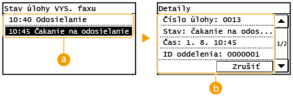 <Detaily>Zobrazuje podrobné informácie o dokumente vybranom zo zoznamu. Ak ste špecifikovali viac miest určenia, počet špecifikovaných miest určenia sa zobrazí na obrazovke. Ak chcete skontrolovať detaily špecifikovaných viacerých miest určenia, ťuknite na <Miesto urč.>. Ak nájdete nepotrebný dokument, ťuknite na položku <Zrušiť> alebo <Odstrániť> a ťuknite na položku <Áno>.