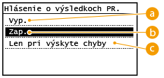 Výpisy prijatých faxových dokumentov môžete skontrolovať vytlačením hlásenia o výsledkoch PR. Hlásenie môžete vytlačiť po každom dokončenom prenose alebo iba vtedy, keď sa vyskytne chyba príjmu.