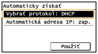 ![]() Ak sa zobrazí voľba <Zap.>, klepnite na možnosť <Automaticky získať> a nastavte voľby <Vybrať protokol> a <Automatická adresa IP> na <Vyp.>.