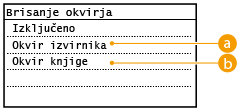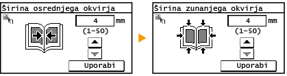 Ko kopirate dokumente, ki so manjši od velikosti papirja za kopiranje, se lahko okoli kopirane slike prikažejo obrisi okvirja. Ko kopirate sosednje strani v debele knjige, se lahko prikažejo temne obrobe. Funkcija <Brisanje okvirja> omogoča izbris teh obrisov okvirja in temnih obrob.