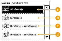 Ko pripravljate več kopij večstranskega dokumenta, lahko izberete možnost <Skupina>, <Sortiranje>, <Obračanje + Združevanje> ali <Obračanje + Sortiranje> za zaporedje kopiranih papirjev. Ta funkcija je uporabna, če želite izdelati izročke za sestanek ali predstavitev.