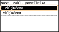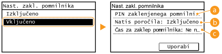 Če želite shraniti prejete dokumente v pomnilnik, za <Nastavitve zaklen. pomnilnika> izberite <Vključeno>. Določite lahko tudi izbirne nastavitve, kot je varnostna nastavitev, pri kateri morate za odklepanje funkcije vnesti geslo, ali časovna nastavitev, ki določa, v katerem delu dneva se bodo faksi sprejemali v pomnilnik.