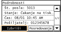 Preverite lahko podrobnosti o dokumentih, shranjenih v pomnilniku, vključno s številkami faksa in številom poslanih strani, nato pa nepotrebne dokumente izbrišete.