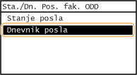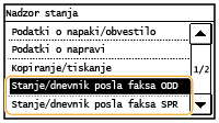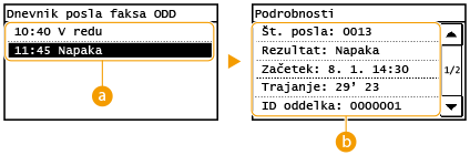 ![]() <Dnevnik posla faksa ODD>/<Dnevnik posla faksa SPR>Prikaz seznama dokumentov, ki so bili oddani ali sprejeti. <OK> je prikazano, če je bil dokument oddan ali sprejet uspešno, oz. <Napaka> je prikazano, če dokument ni bil uspešno poslan ali sprejet zaradi preklica ali pojava napake.
