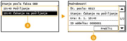 ![]() <Stanje posla faksa ODD>/<Stanje posla faksa SPR>Prikaz seznama dokumentov, ki so v fazi oddajanja ali sprejema ali čakajo na obdelavo.