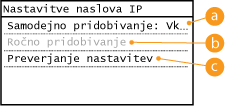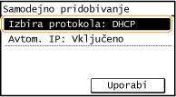 ![]() ![]() Če za dodeljevanje naslova IP ne želite uporabiti DHCP/BOOTP/RARP Izberite <Izključeno>. Če izberete <DHCP>, <BOOTP> ali <RARP>, ko te storitve niso na voljo, bo naprava porabila veliko časa in komunikacije za odkrivanje teh storitev v omrežju. |
