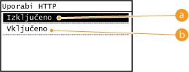 HTTP se uporablja za omrežno komunikacijo, na primer za dostop do naprave iz vmesnika Remote UI (Oddaljeni uporabniški vmesnik). Če uporabljate povezavo USB ali tudi sicer ne uporabljate HTTP, lahko HTTP onemogočite in tako preprečite zlonamerne vdore tretjih oseb prek neuporabljenih vrat HTTP.