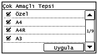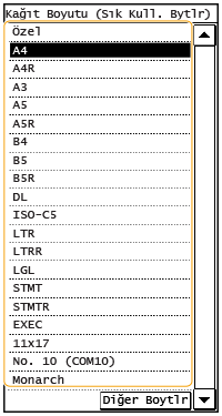 Onay işareti olmayan kağıt boyutları <Kağıt Boyutu (Diğer Boyutlar)> ekranında görüntülenir.