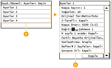 Kopyalama ayarları için en fazla dört sık kullanılan birleşim kaydedebilirsiniz. İhtiyacınız olduğunda kayıtlı bir ayar birleşimini seçerek her kopyalama yaptığınızda aynı ayarları yapılandırma gereksinimini ortadan kaldırabilirsiniz, örneğin kopya sayısını sıklıkla 5 olarak ayarlıyorsanız <Çerçeve Sil> öğesini <Açık> olarak ayarlayın ve kopyalama sırasında keskinliği artırın. Ayar birleşimlerini <Ayarlar 1> - <Ayarlar 4> olarak ayarlayabilirsiniz.