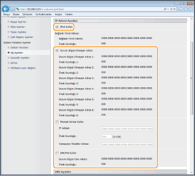 Makinenin IPv6 adresleri, Uzak Kullanıcı Arabirimi aracılığıyla yapılandırılabilir. IPv6 adreslerini ayarlamadan önce, IPv4 adres ayarlarını denetleyin (IPv4 Ayarlarını Görüntüleme). IPv6 adreslerini kullanmak için doğru IPv4 ayarlarını ayarlamanız gerekir. Tarayıcı sürücüsünü veya MF Toolbox'ı kullanan tarama işlevinin bir IPv6 ortamında kullanılabilir olmadığını unutmayın. Makine, şu IPv6 adreslerinden en fazla dokuzunu kullanabilir: