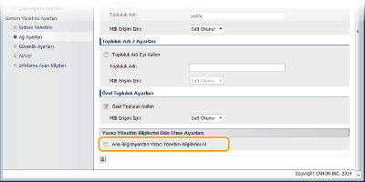 SNMPv1'i Devre Dışı BırakmaYazıcı sürücüsü üzerinden makine bilgilerinin elde edilmesi gibi bazı makine işlevleri kullanılamaz duruma gelebilir.