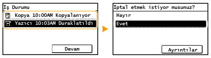 Uzak Kullanıcı Arabiriminden İptal EtmeYazdırmayı Uzak Kullanıcı Arabirimindeki [Yazdır: İş Durumu] sayfasından iptal edebilirsiniz: Yazdırma Belgelerinin Geçerli Durumunu Denetleme