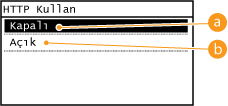 HTTP, Uzak Kullanıcı Arabirimi aracılığıyla makineye erişmeniz gibi durumlarda ağ üzerinden kurulan iletişimler için kullanılır. Bir USB bağlantısı kullanıyorsanız veya HTTP kullanmıyorsanız, kullanılmayan HTTP bağlantı noktası aracılığıyla kötü niyetli üçüncü taraf izinsiz giriş teşebbüslerini engellemek için HTTP'yi devre dışı bırakabilirsiniz.