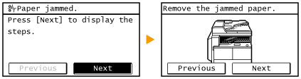 У разі зминання паперу на екрані відображатиметься повідомлення <Paper jammed.>. Натисніть кнопку <Next>, щоб переглянути прості варіанти вирішення проблеми. Якщо зрозуміти те, що показано на екрані, важко, перегляньте наведені нижче розділи. У них пояснюється, як усунути проблему зі зминанням паперу.