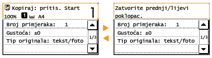 Poruke se prikazuju pri vrhu zaslona ako je razina tonera niska ili je poklopac ostao otvoren. Prikaz se mijenja iz prikaza običnog zaslona u prikaz poruke.