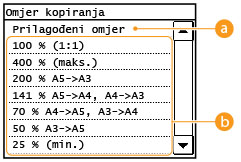 Kopije možete povećati ili smanjiti pomoću unaprijed postavljenih omjera kopiranja, kao što je <A5> → <A4> ili postavljanjem prilagođenog omjera kopiranja u koracima od 1 %.