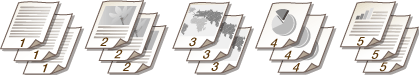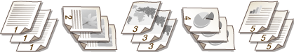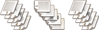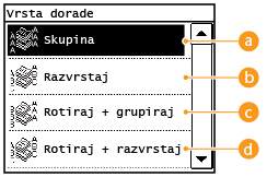 Prilikom pripreme višestrukih kopija dokumenata od više stranica možete odabrati <Skupina>, <Razvrstaj>, <Rotiraj + grupiraj> ili <Rotiraj + razvrstaj> za redoslijed kopiranja papira. Ta je funkcija korisna prilikom pripreme materijala za sastanke ili prezentacije.