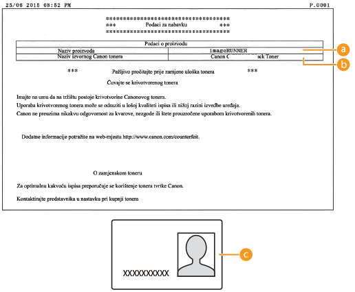 Možete podesiti ispisivanje informacija za kupovinu potrošnog materijala. Ispisuju se sljedeće stavke: