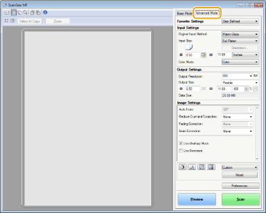 Ako na zaslonu ScanGear MF kliknete karticu [Advanced Mode] (Napredni način rada), možete izvršiti naprednija prilagođavanja kvalitete slike nego u jednostavnom načinu rada. Prilagođene postavke možete registrirati kao omiljene postavke. Da biste doznali više, kliknite ikonu