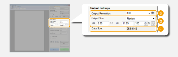 Prikazuje veličinu podataka slike kada je skenirana s postavljenim mogućnostima [Output Resolution] (Izlazna razlučivost) i [Output Size] (Izlazni format).