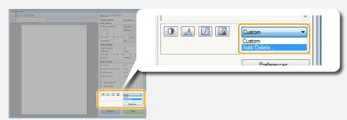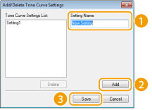 Prikazat će se zaslon [Add/Delete Tone Curve Settings] (Dodavanje/brisanje postavki krivulje tonova) ili [Add/Delete Threshold Settings] (Dodavanje/brisanje postavki praga).