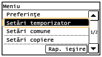 Toate setările pentru temporizator sunt listate cu o scurtă descriere. Setările implicite sunt marcate cu un semn (