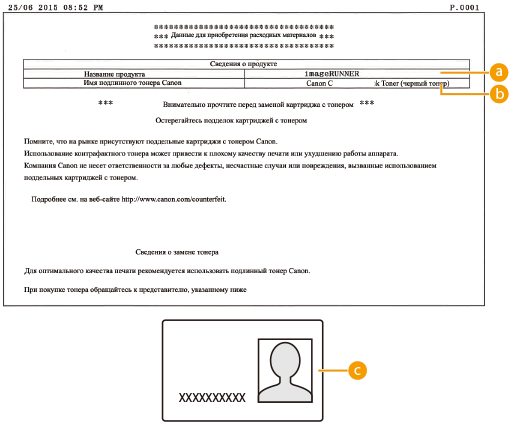 Выберите режим печати данных для приобретения расходных материалов. Печатаются следующие элементы: