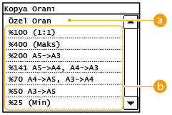 <A5> → <A4> gibi önayarlı bir kopya oranını kullanarak veya %1'lik artışlarla özel bir kopyalama oranı ayarlayarak kopyaları büyütebilir ya da küçültebilirsiniz.