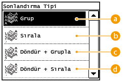 Çok sayfalı belgelerin birden fazla kopyasını hazırlarken kopyalanan kağıtların sırası için <Grup>, <Sırala>, <Döndür + Grupla> ya da <Döndür + Sırala> seçebilirsiniz. Bu işlev, toplantılarda veya sunumlarda dağıtmak üzere belgeler hazırlanırken kullanışlıdır.