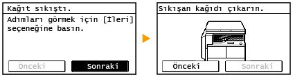 Kağıt sıkışırsa, ekranda <Kağıt sıkıştı.> görüntülenir. Basit çözümleri görüntülemek için <Sonraki> öğesine basın. Ekrandaki yordamlar anlaşılmıyorsa sıkışan kağıtları temizlemek için aşağıdaki bölümlere bakın.