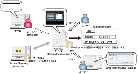 ローカルデバイス認証+Active Directory認証、または、ローカルデバイス認証+LDAP認証 | Active Directory認証とローカルデバイス認証、または、LDAP認証とローカルデバイス認証の、サーバー認証/ローカルデバイス認証の両方に対応したユーザー認証方式です。たとえば、社員などの認証サーバーに登録されているユーザーをActive Directory認証/LDAP認証で管理し、外部スタッフなどの一時的なユーザーをローカルデバイス認証で管理します。 ネットワーク障害など、何らかの原因で認証サーバーにアクセスできなくなった場合でも、ローカルデバイス認証でデバイスを使用することができるので、Access Management Systemでは、この方式による運用をおすすめします。 LDAP認証は、LDAPサーバーに登録されているユーザー情報を使用してユーザー認証を行います。 |