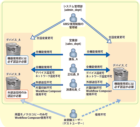 課長_A | [sales_manager] / [m_password] | [PowerUser] | すべてのデバイス機能を使用可。 [設定/登録]画面については、一部の機能を除き、使用不可。 |