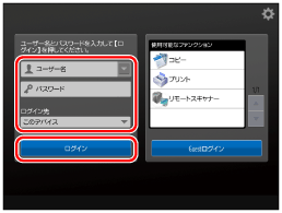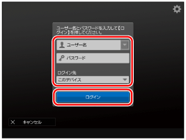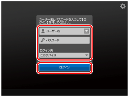 使用制限の管理者ユーザーのユーザー名とパスワードを入力し、[ログイン先]で[このデバイス]を選択して、 [ログイン]を押します。